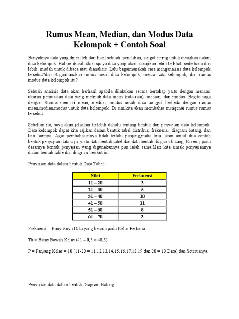 Mean, median, dan modus merupakan bahasan materi statistika dalam analisis ukuran pemusatan data. Diagram batang menggambarkan berbagai keterangan dengan berabgai gambar batang tegak atau mendatar dan. Diagram batang adalah diagram yang berdasarkan data kategori atau kelompok, misalnya untuk menyajikan jumlah penduduk disuatu daerah pada selang waktu tertentu, jumlah siswa dibeberapa daerah pada waktu tertentu dan sebagainya. Perhatikan gambar diagram batang di bawah. Banyaknya data yang didapat dari penelitian, kerap disajikan berbentuk data kelompok.
